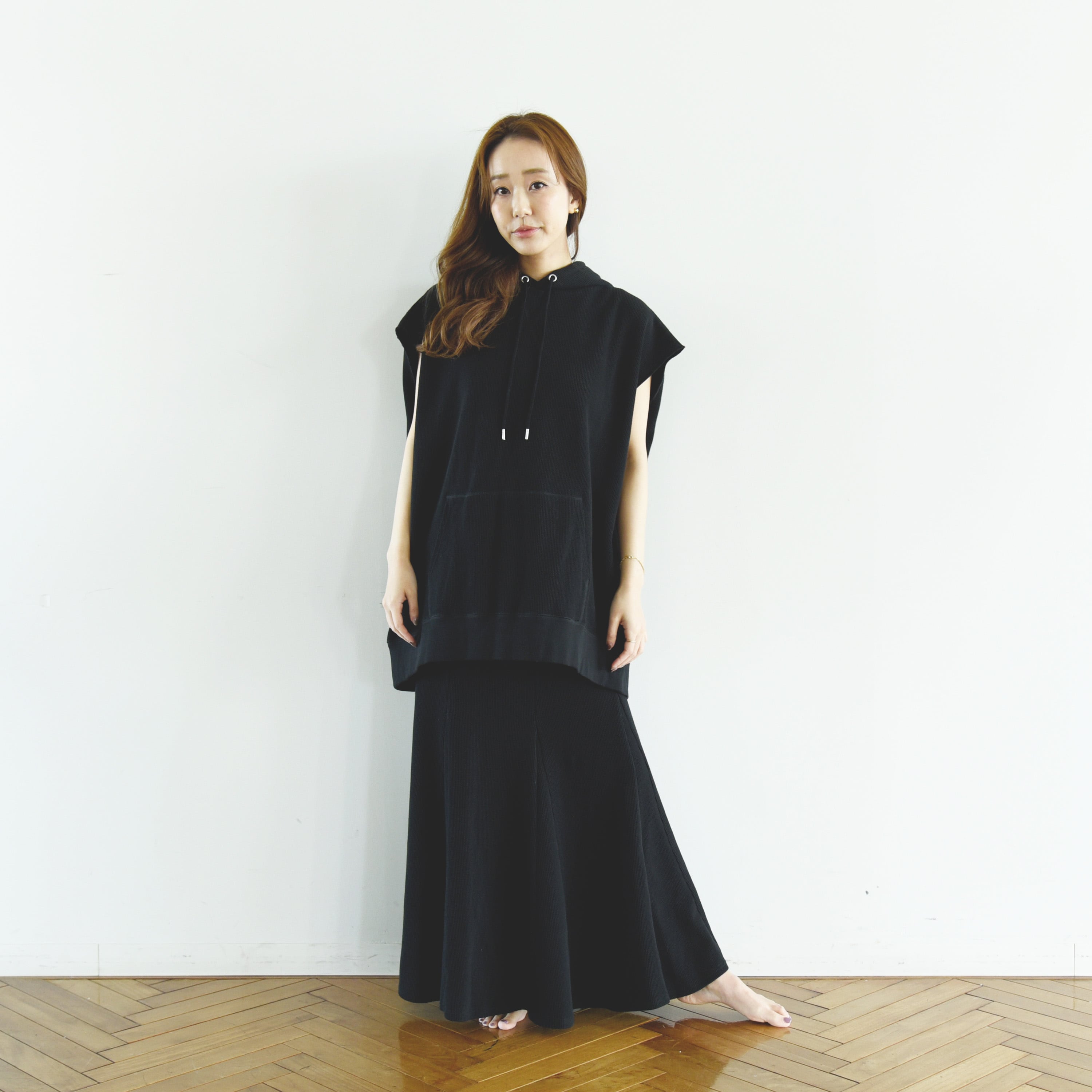 同素材のプルパーカーと合わせて、ワンピース風に着こなすのもおすすめです。